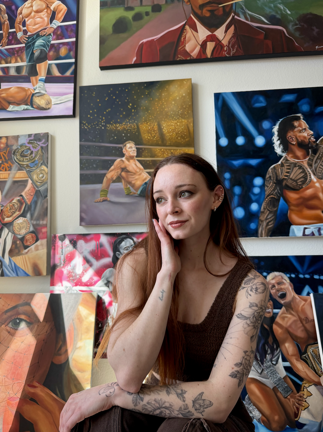 Naomi Rosenblum is a Las Vegas-based contemporary painter known for large-scale mixed-media works exploring combat sports, performance, and identity. Her ongoing Fight Series translates the intensity and mythology surrounding fighters across professional wrestling and MMA into expressive contemporary portraiture.
